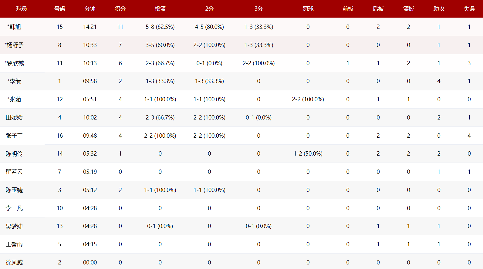 全场比赛杨舒予24分28秒,14中10,三分9中5,拿到25分2助攻1失误,她是全队得分最多的那个。